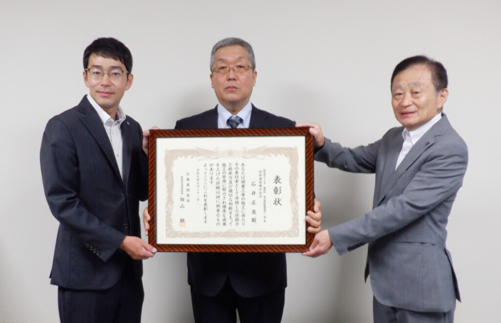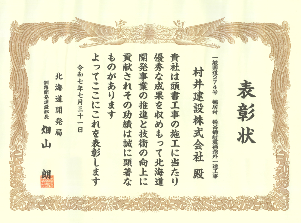「一般国道274号鶴居村幌呂橋耐震補強外一連工事」において当工事と担当職員に対し、北海道開発局釧路開発建設部長より表彰状が授与されました。