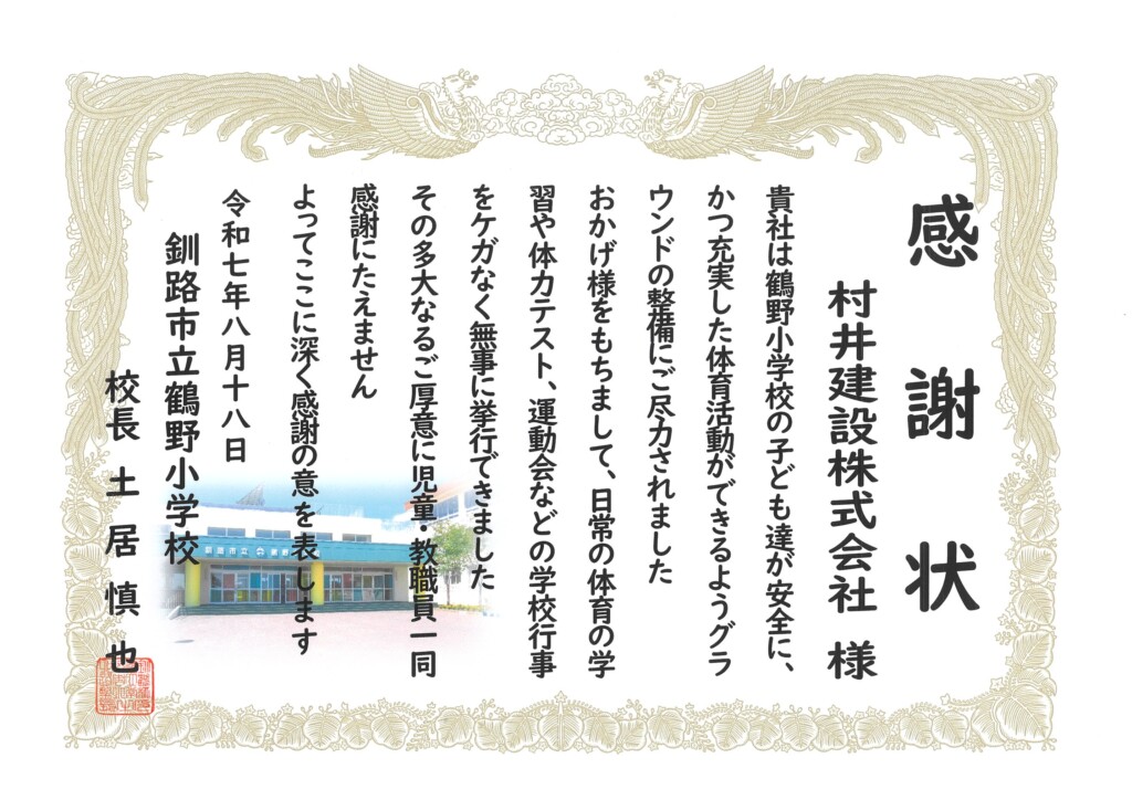 地域貢献として実施した釧路市立鶴野小学校のグラウンド整備に対し、同校より感謝状が授与されました。