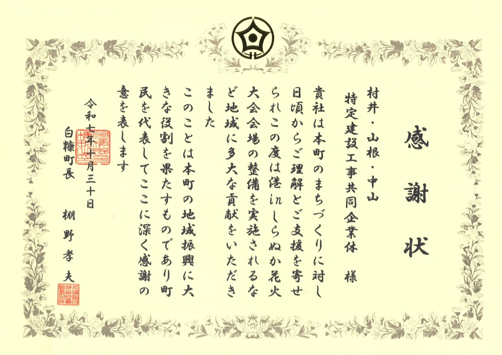 地域貢献活動として港inしらぬか花火大会会場整備を実施し、村井・山根・中山特定建設工事共同企業体に対して白糠町より感謝状を授与されました。