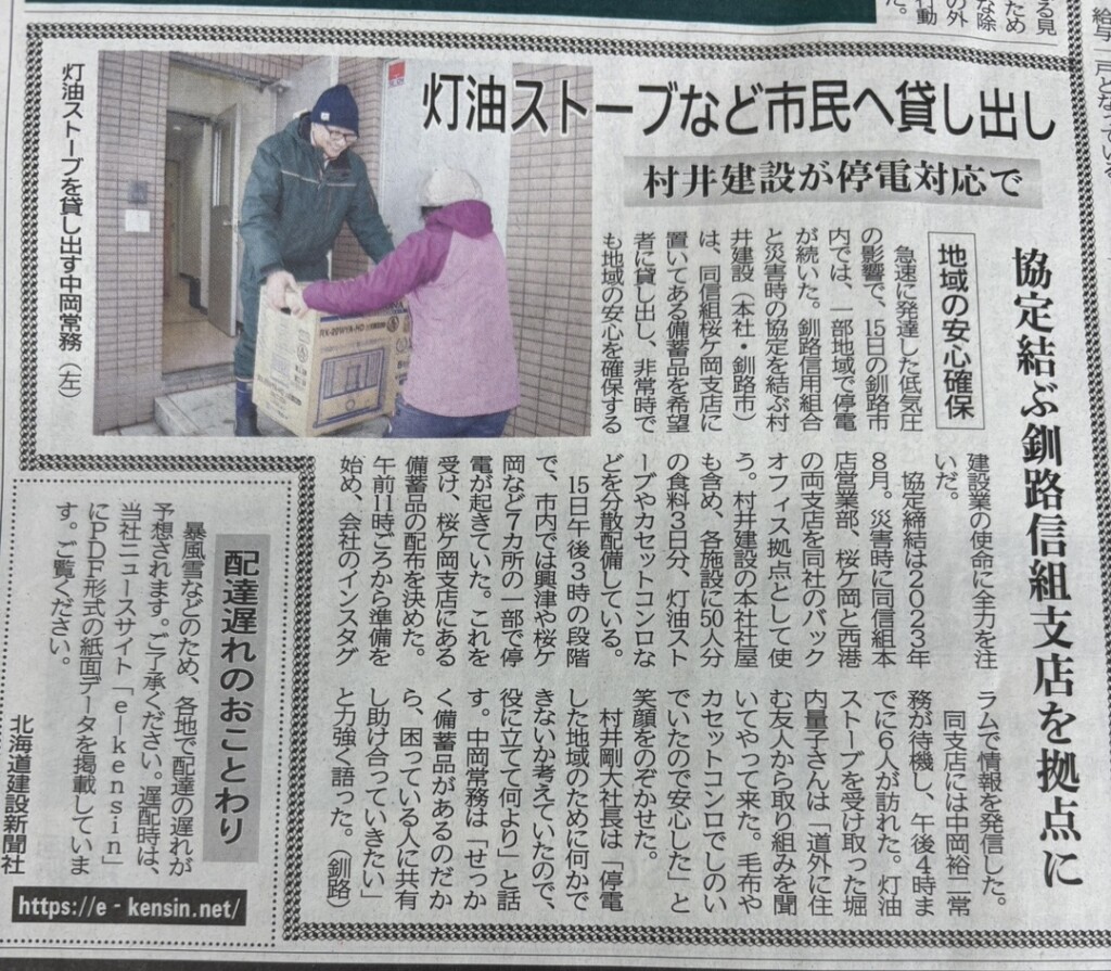 12月15日に発生した大雪による停電等の影響に対し、地域貢献活動として地域住民の方々へ備蓄品の配布や暖房器具の貸し出しを行いました。
