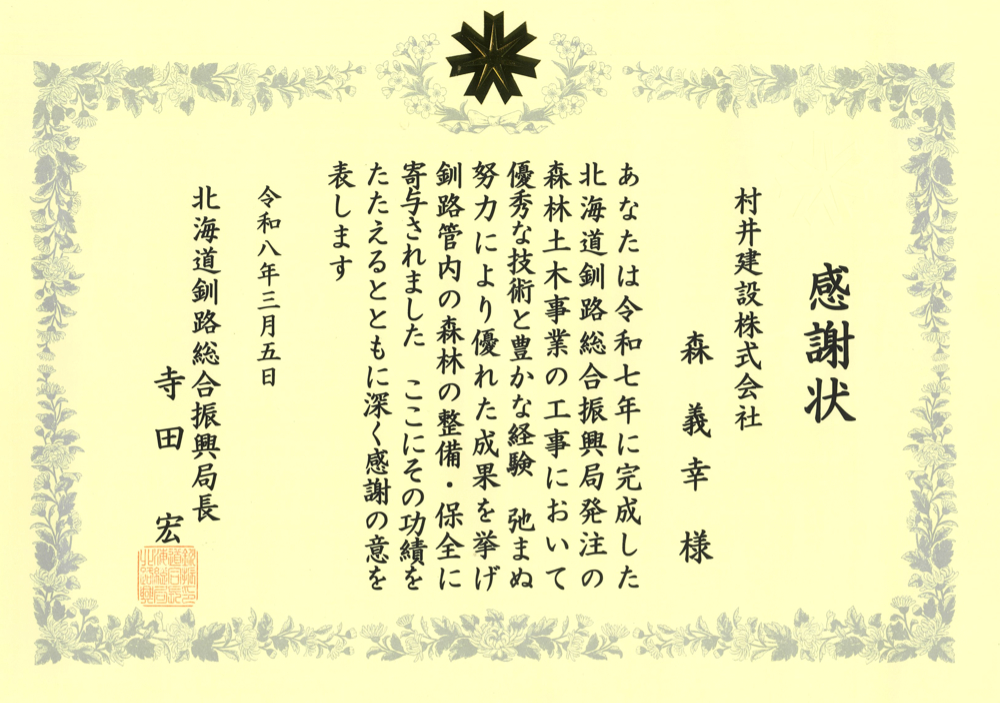 北海道釧路総合振興局より、令和7年度の森林土木事業の施工を担当した当社職員に対し「2025年優秀技術者等感謝状」が授与されました。
